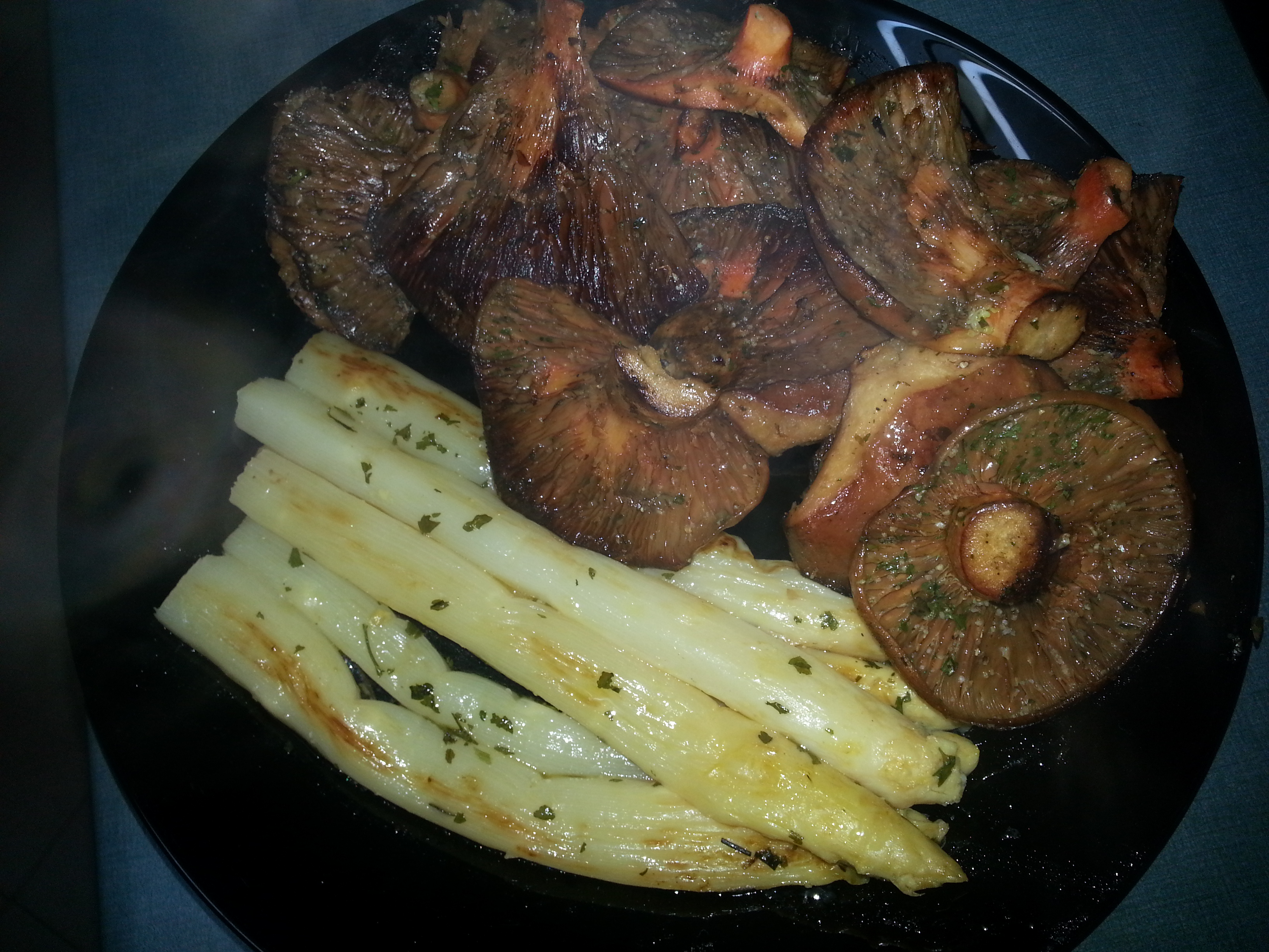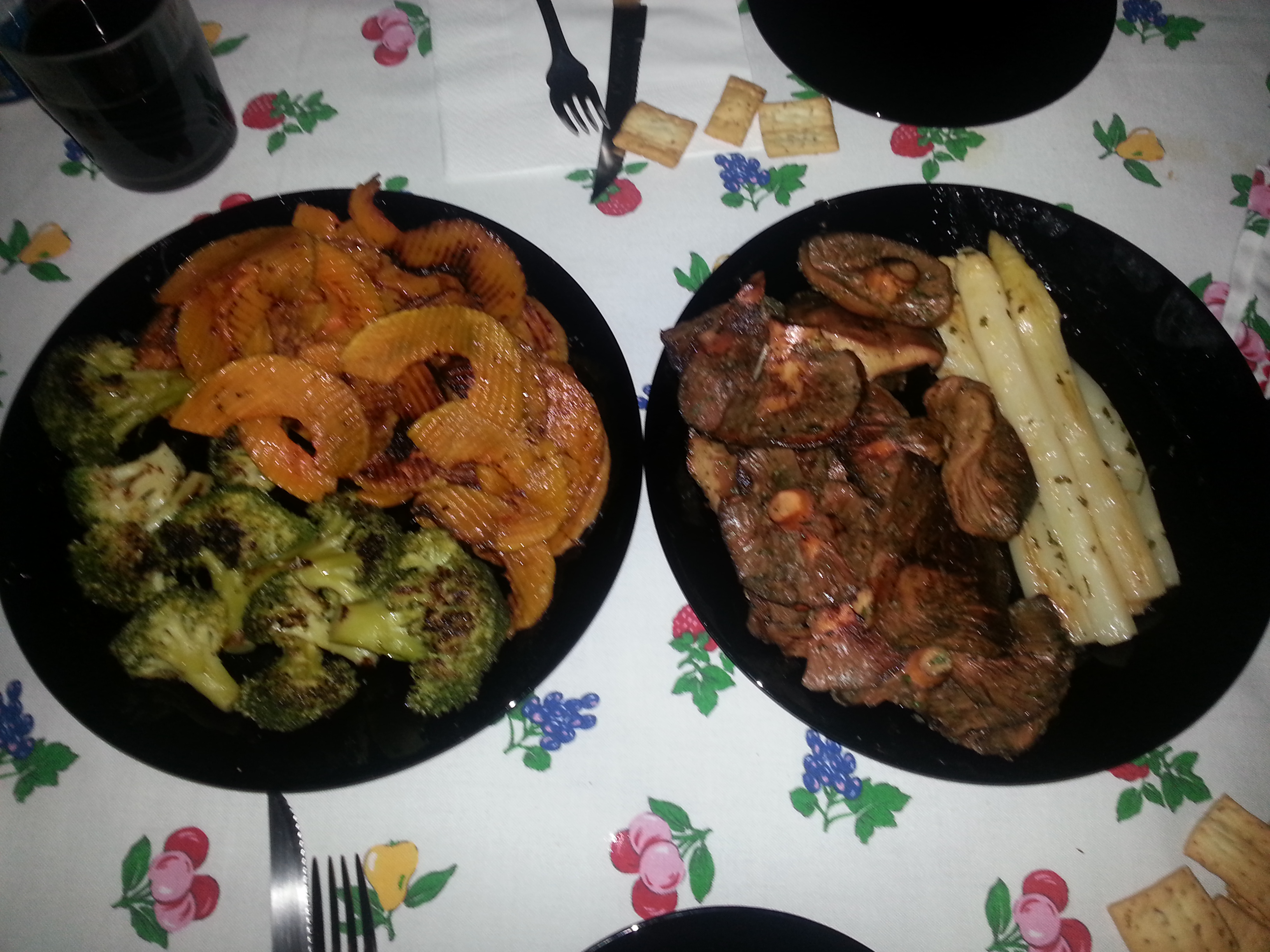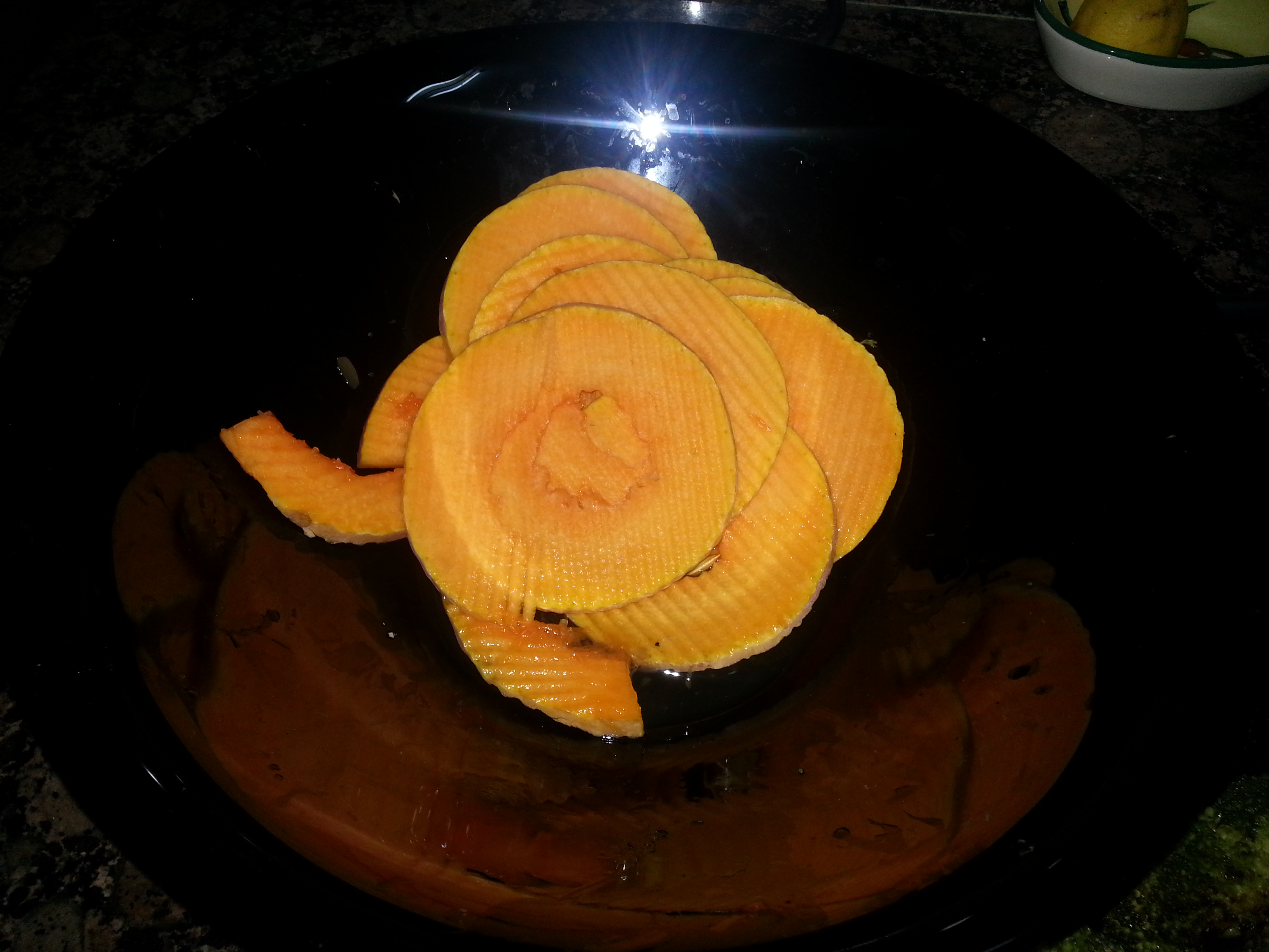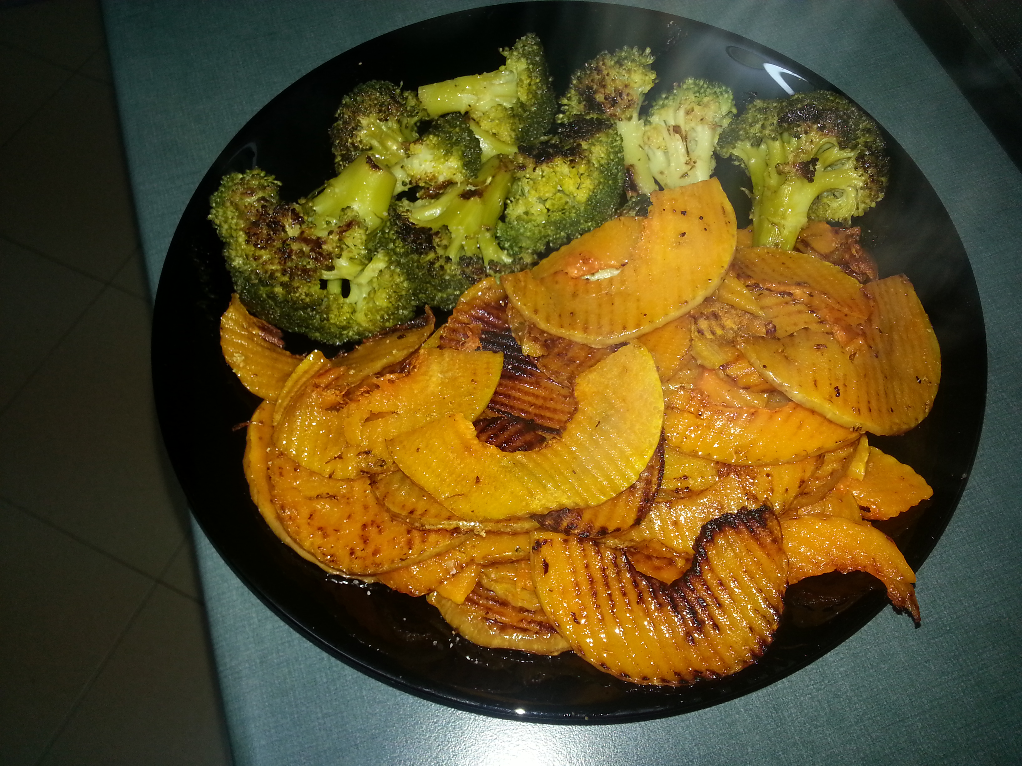 Preparar las verduras para la plancha, como por ejemplo cortar a rodajas finas la calabaza y a trocitos la brocoli, trocear las setas….Simplemente pasar las verduras por la plancha vuelta y vuelta con un poquito de aceite hasta que se hagan con la sal, el perejil y el ajo molido.