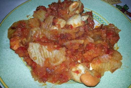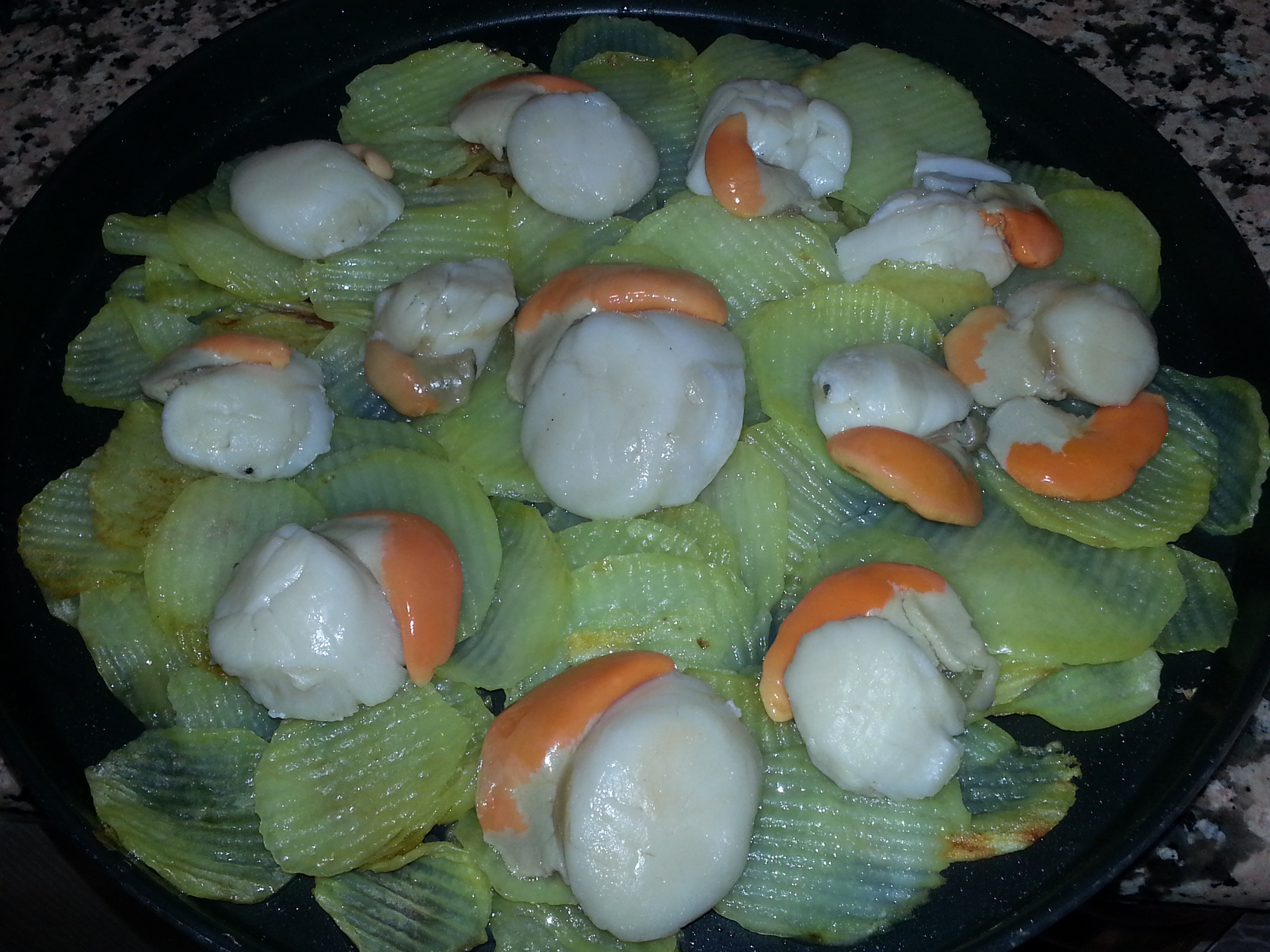 Primero pelar y cortar a rodajas las patatas para hacer una base y meter al horno. Mientras lavamos bien las vieiras para quitarle la posible tierra, yo las compro sin cascara y congeladas, a continuacion se meten en el microondas unos minutos y reservar. Mientras tanto hacemos un sofrito con ajo, cebolla, pimiento verde, pimiento rojo y el tomate frito, una vez pochado añadir a trocitos el chorizo y el jamon, cuidado con la sal ya que lleva el jamon pero un poquito no le viene mal. una vez todo preparado procederemos a colocar encima de las patatas las vieiras bien repartidas, se cubren con el sofrito, se cubre con pan rallado y se mete en el horno o micro y lo gratinamos con la idea que se quede una capa crujiente.