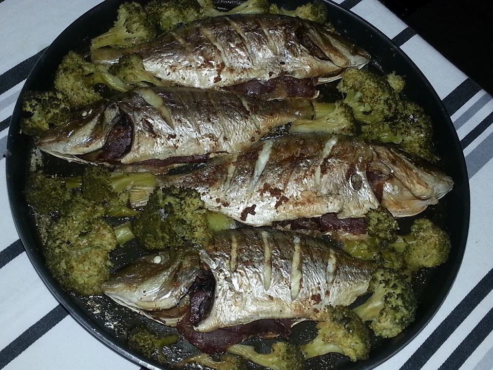 Lo primero que hacemos es preparar y hervir un poco la brocoli, mientras limpiamos el pescado y le hacemos unos cuatro o cinco cortes por los lomos para que se haga mejor en el horno. Por otro lado en una sarten pequeña se frie en aceite de oliva el ajo molido, solo un poquito ya que luego estara en el horno y se vaya a quemar, con una brocha de silicona se unta por todos lados, por dentro y por fuera y se le mete dentro en el corte unos trozos de las lonchas de jamon. Para finalizar se colocan los pescados y la brocoli en la bandeja de horno y se le añade la sal y el vaso de vino blanco y al horno hasta que se dore un poco la piel y se reduzca el vino