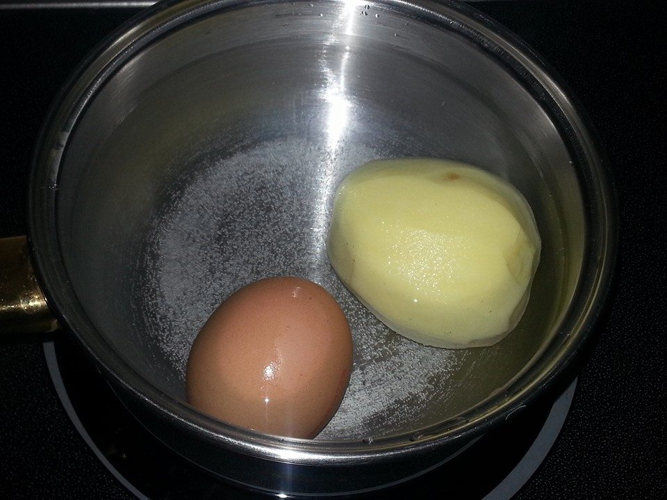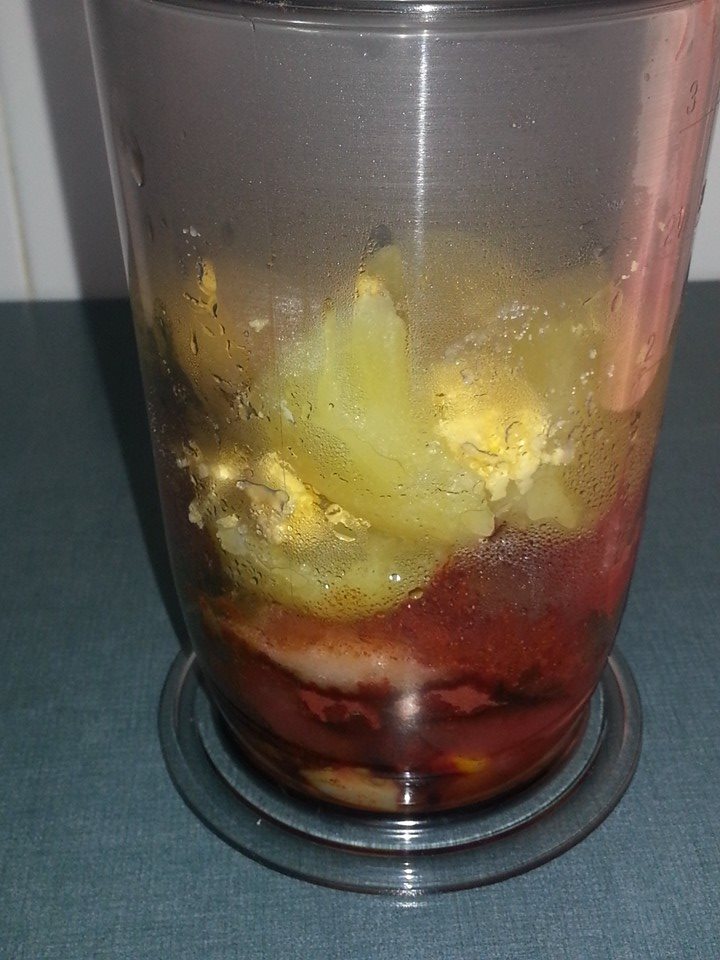 Poner a hervir el huevo para obtener la yema y la patata, yo en vez de media logicamente una mediana, como un puño mas o menos y quedo bien, y la yema la eche entera, pero vamos yo os paso la receta que me dieron. Una vez tierna la patata y sacada la yema echar todos los ingredientes en el vaso de la batidora y batir hasta que se quede todo bien mezclado y listo para acompañar unas patatas, carnes o lo que se quiera. Lo mas caracteristico es con las papas arrugas. Hay una variante y es pasar por mortero en vez de batir los ajos, el comino y las guindillas, pero a mi parecer y es lo que recomiendo es pasar todo por la batidora.