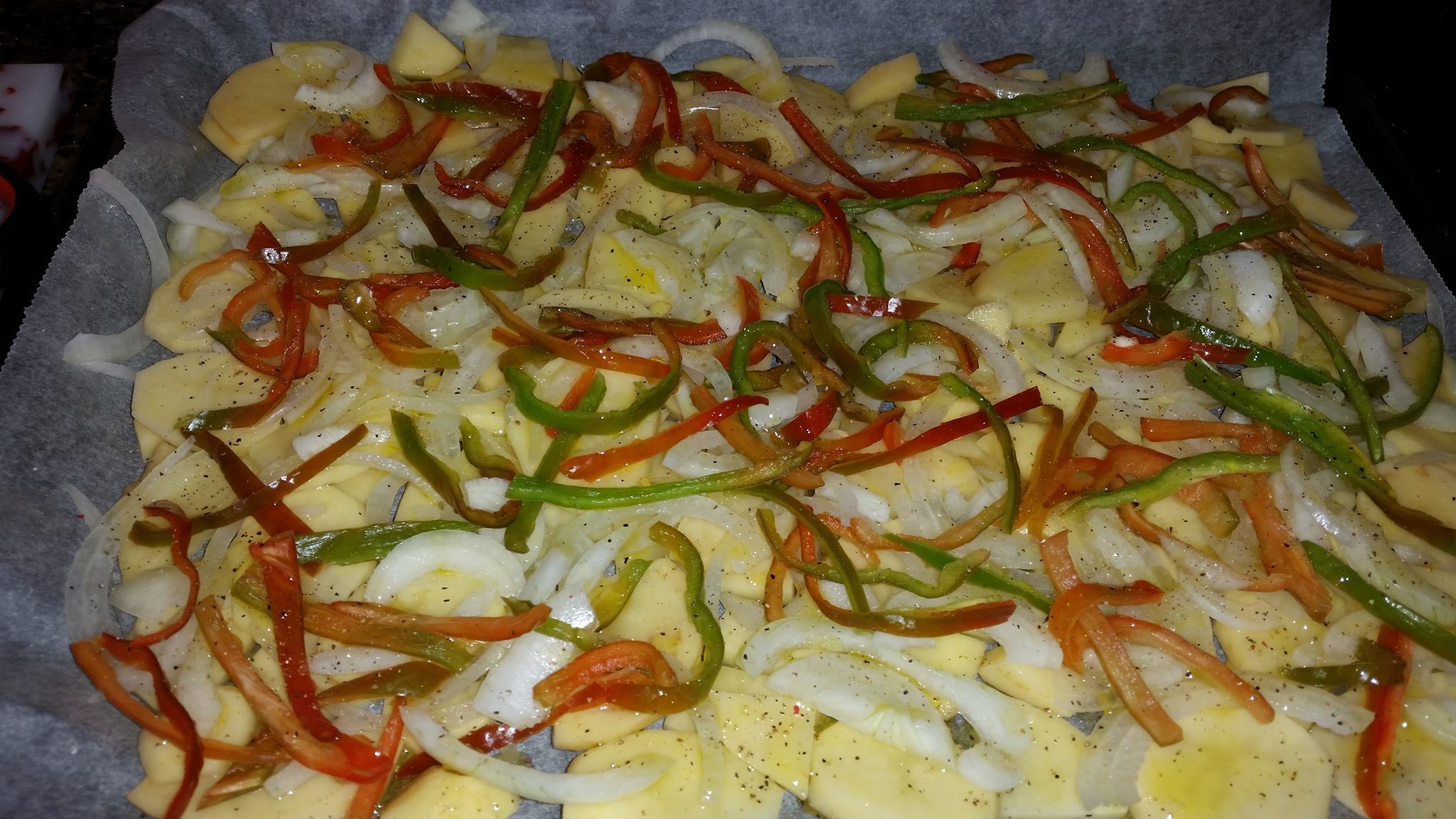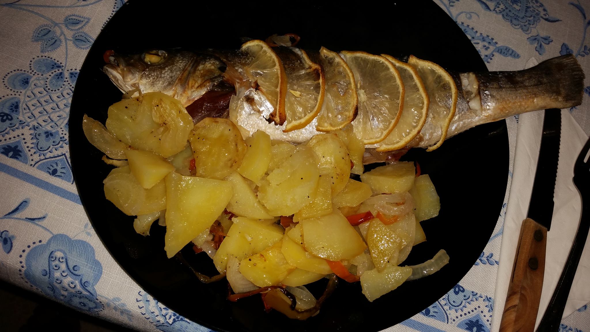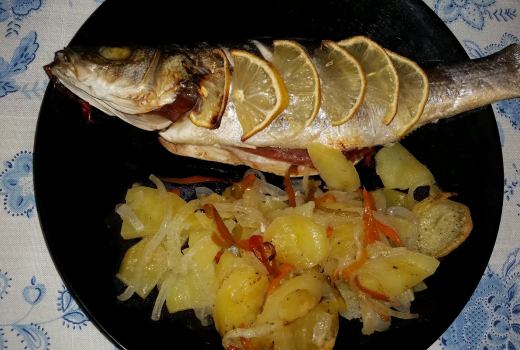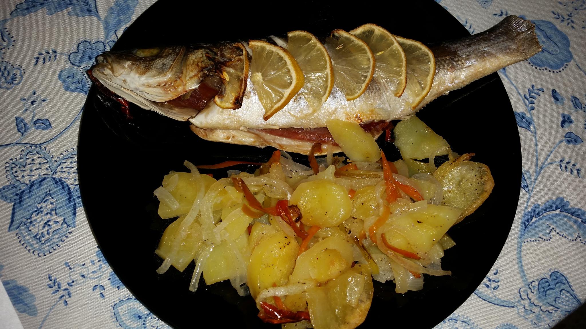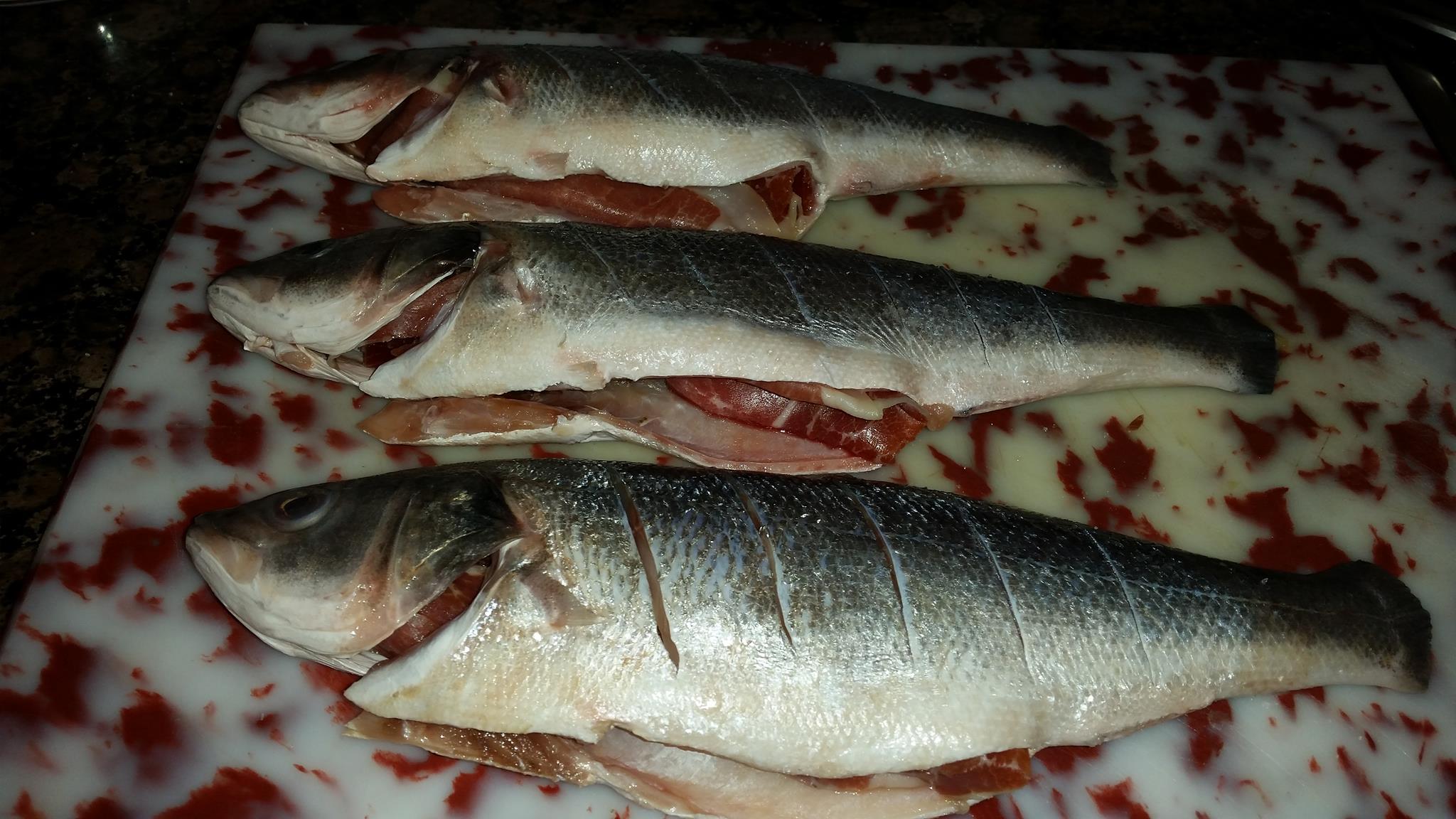 Otra receta rica, facil y sana. Unas lubinas al horno rellenas de jamon con patatas y pimientos