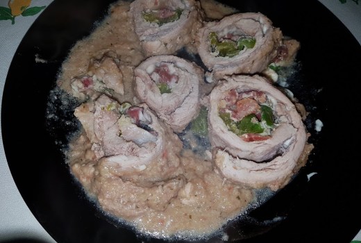 Lo primero que haremos es abrir el solomillo para dejarlo lo mas fino posible, sino sabéis que os lo hagan en la carnicería, yo lo fui abriendo con el cuchillo como si tratara de desliar con el cuchillo un rollito, casi paralelo a su forma y profundizando, y rematando con el martillo de madera para aplastar todo por igual, la verdad que no me quedo mal para no ser un profesional de las carnes. Una vez bien extendido comenzaremos por cubrir toda la superficie con las lonchas de jamón serrano, seguidamente le fui añadiendo por tiras los diferentes quesos antes nombrados y las tiras de pimiento verde, la verdad que como relleno admite todo lo que os guste y tengáis en casa, sustituyendo algún ingrediente por otro, yo os dejo como lo hice yo. Una vez todo relleno despacito lo vamos liando a modo de rollito como si fuera un flamenquin y lo atamos bien con el hilo de cocina para que no se nos abra mas tarde. Una vez terminado y bien atado insistiendo en las puntas para que no se nos abra lo sellamos en una cazuela con aceite de oliva, bien por todos los lados y reservamos. A continuación seguimos con el sofrito de la salsa, para lo cual en ese mismo aceite doramos un poquito los dientes de ajo bien picados anteriormente, seguidamente haremos lo mismo con el puerro y la cebolla, picada tambien anteriormente, agregamos las dos hojas de laurel. Una vez bien pochado nuestro sofrito, añadimos una cucharada de maizena para que se sofría, moveremos para quitar bien los grumos durante unos minutos. Seguidamente añadimos el vino blanco y dejamos que se evapore el alcohol, pasados unos cinco minutos aproximadamente añadimos la pastilla de caldo de pollo y el agua y tras unos minutos lo pasamos todo por la batidora excepto las hojas de laurel que apartaremos para añadirlas posteriormente otra vez. Una vez todo batido volvemos a poner al fuego. Por otro lado en una picadora picamos como si de un crocanti se tratara los frutos secos, en este caso los pistachos y los piñones, y lo añadimos al sofrito batido, para que luego aparezca en la salsa y carne, movemos bien y añadimos una poca pimienta molida. Seguidamente incorporamos el solomillo, añadimos una poca de agua y dejamos cocinar y que se reduzca la salsa a fuego medio. Una vez cocinado sacamos el rollito, quitamos el hilo y lo cortamos con cuidado en rodajas no muy gruesas y las ponemos en un recipiente, para terminar la salsa reducida la añadimos cubriendo los trocitos de rollo. Y listo para comer, como siempre digo todas las comidas con salsa si se hacen de un día para otro mas bueno esta, Preparaos para mojar sopas, acompañado con patatas esta riquísimo tambien, como veréis en mi caso no le añadí sal ninguna pues la que lleva el jamón, el queso y la pastilla de caldo fue suficiente, el queso azul le da un sabor especial y en mi caso fue suficiente. Solo es cosa de cuando esta reduciendo el caldo que lo probéis por si necesitara algo de sal. Espero que os guste y hasta la próxima.