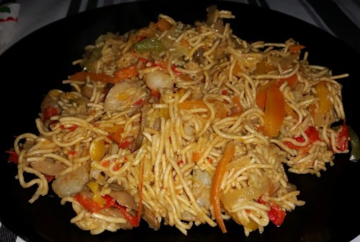 Lo primero que haremos es cortar en juliana o bastoncitos e ir reservando todas las verduras, los pimientos, los dientes de ajo, las zanahorias, la cebolla y los champiñones si son frescos. Por otro lado en un wok o cazuela que tengais pondremos a calentar un buen chorreon de aceite de oliva, hay quien usa de girasol, para mi gusto mejor sabor lo da el de oliva. Sofreimos los ajos y una vez que esten doraditos añadimos las verduras excepto los champiñones que son mucho mas tiernos, vamos sofriendo y sal pimentamos al gusto. Una vez la verdura tierna añadiremos los champiñones y las gambas. Por otro lado en un cazo pondremos a hervir el caldo de verdura con un chorreon de aceite de oliva y un poquito de salsa de soja. Cuando rompa a hervir apartaremos del fuego y añadiremos los fideos chinos, lo dejaremos el tiempo que nos pone en el paquete, en este caso cuatro minutos. A continuacion colaremos los fideos y el caldo lo podremos reservar para una sopita de arroz por ejemplo. Bien una vez escurridos los fideos los agregamos al wok y removeremos durante unos dos minutos con un buen chorreon de salsa de soja. Pasado dicho tiempo estara listo para servir. Os aseguro que estan practicamente igual o mejor que los que nos ponen por ahi. Pues como siempre decimos la cocina casera …..