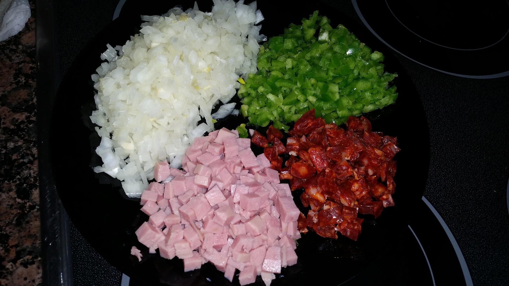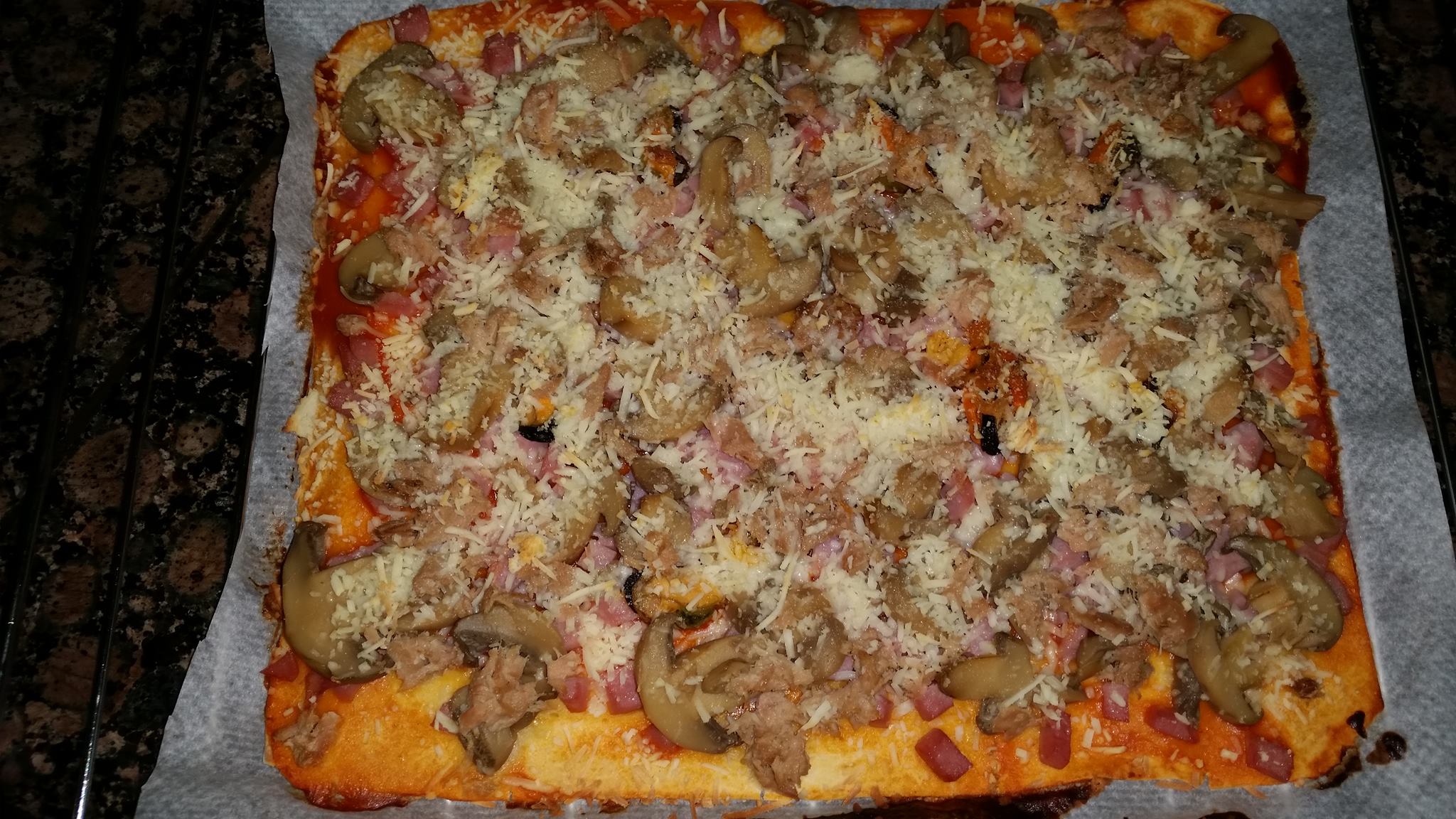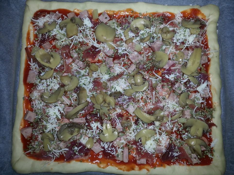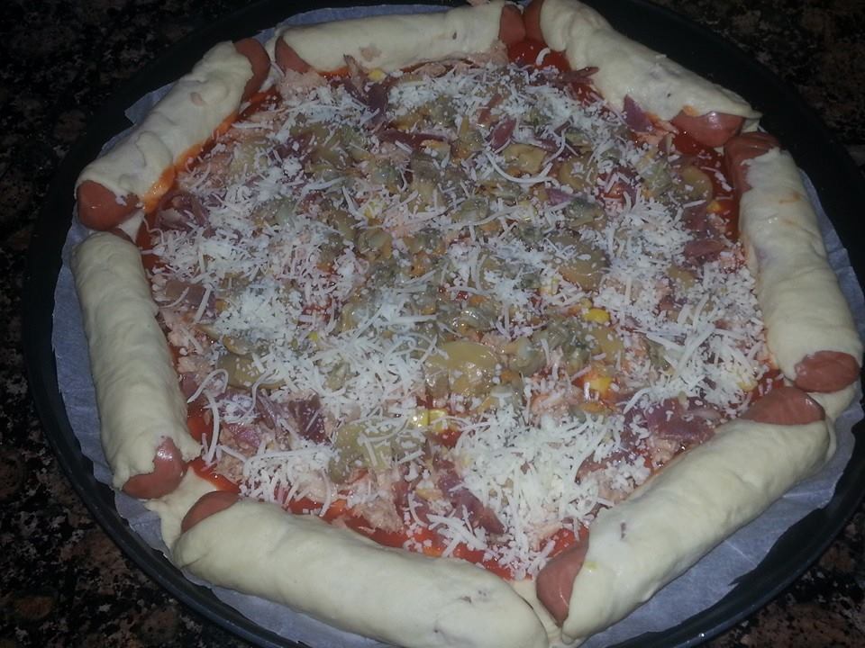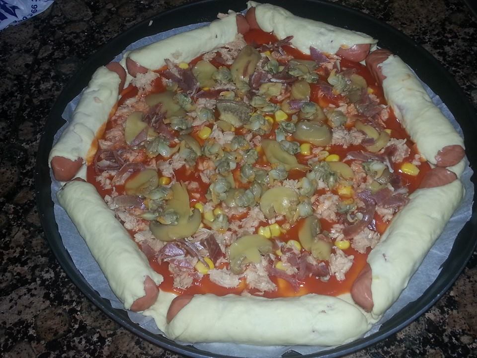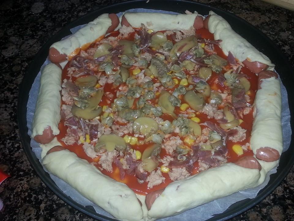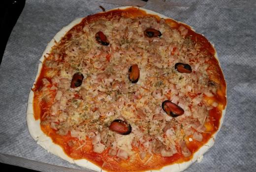 Lo primero que haremos es cortar a filetes las dos mitades de la pechuga, si no disponeis de ellas ya cortadas por el carnicero. Ponerlas al horno un ratito mientras se va preparando el picado de cebolla, pimiento, jamon de pavo y el chorizo o pasarlas un poco en una sarten, mas que nada para que se selle por fuera pero sin terminar de hacer. En un bol mezclamos el tomate con el resto de ingredientes y rellenamos los filetes a modo de pizza, por ultimo las cubrimos con queso rallado y listo para el horno hasta que se funda y dore el queso