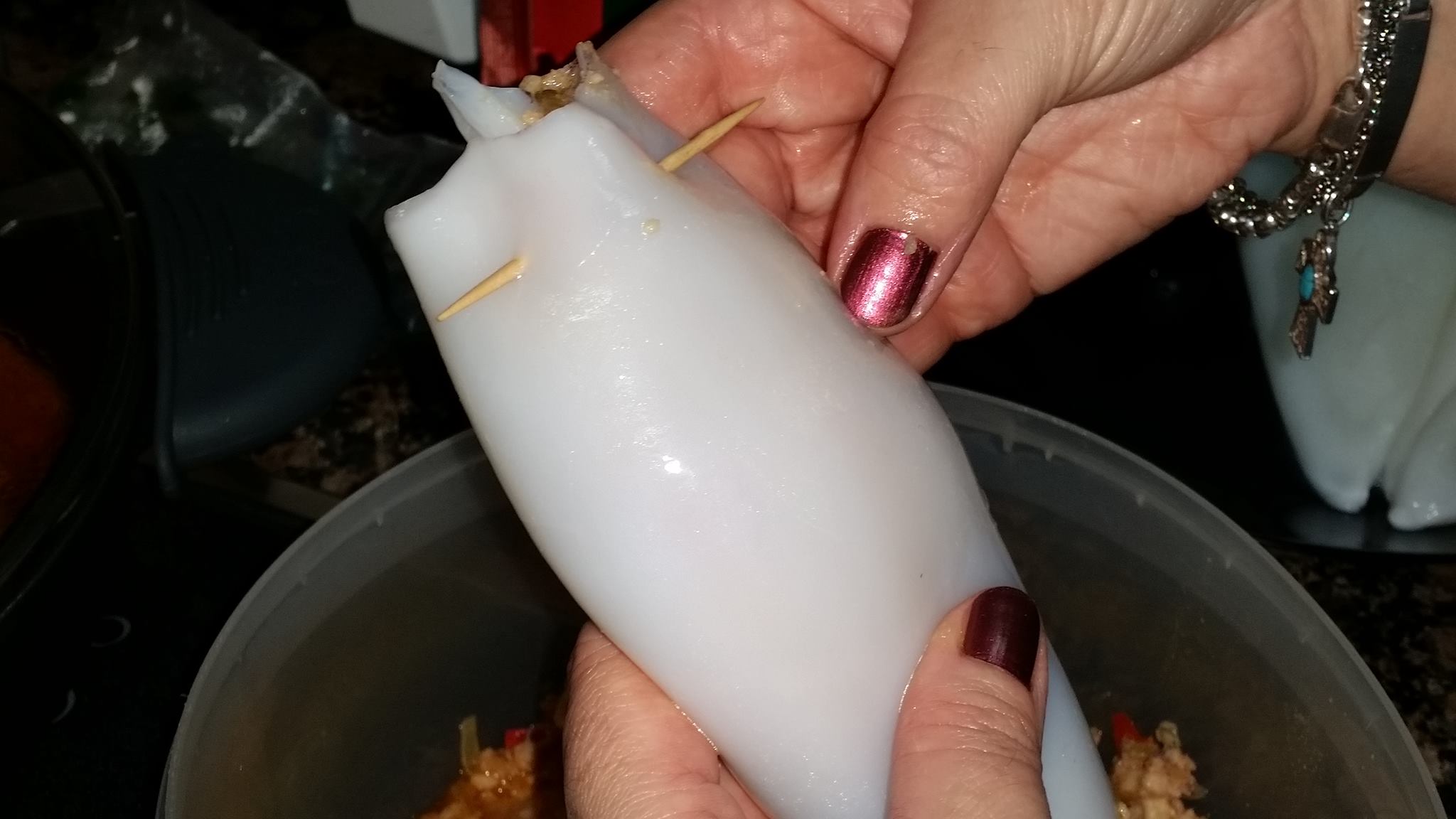 ¿Que os parece la receta que ha tocado hoy? Calamares rellenos en salsa. Algo laboriosa por el tiempo que lleva pero que no es nada dificil y os aseguro que el resultado merece la pena, y con el siguiente procedimiento que os dejo y fotos paso a paso espero que sea mas facil todavia. Para esta receta conte con la ayuda de Dori para rellenarlos y para algunas fotos mientras yo iba preparando las cosas del sofrito de la salsa. Los ingredientes se tendran en cuenta en funcion de la cantidad que se hagan. Yo hice ocho calamares grandes. Es una receta que admite muchos ingredientes en el relleno, yo no quise hacer muchas mezclas y que cuando se coman sepan a calamar por eso no le he añadido ni carne, ni huevo duro, ni aceitunas… ni otras muchas cosas que le iran muy bien pero como ya hemos dicho en otras ocasiones sobre gustos colores…