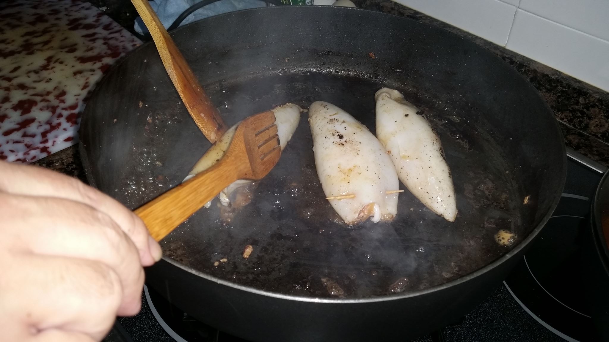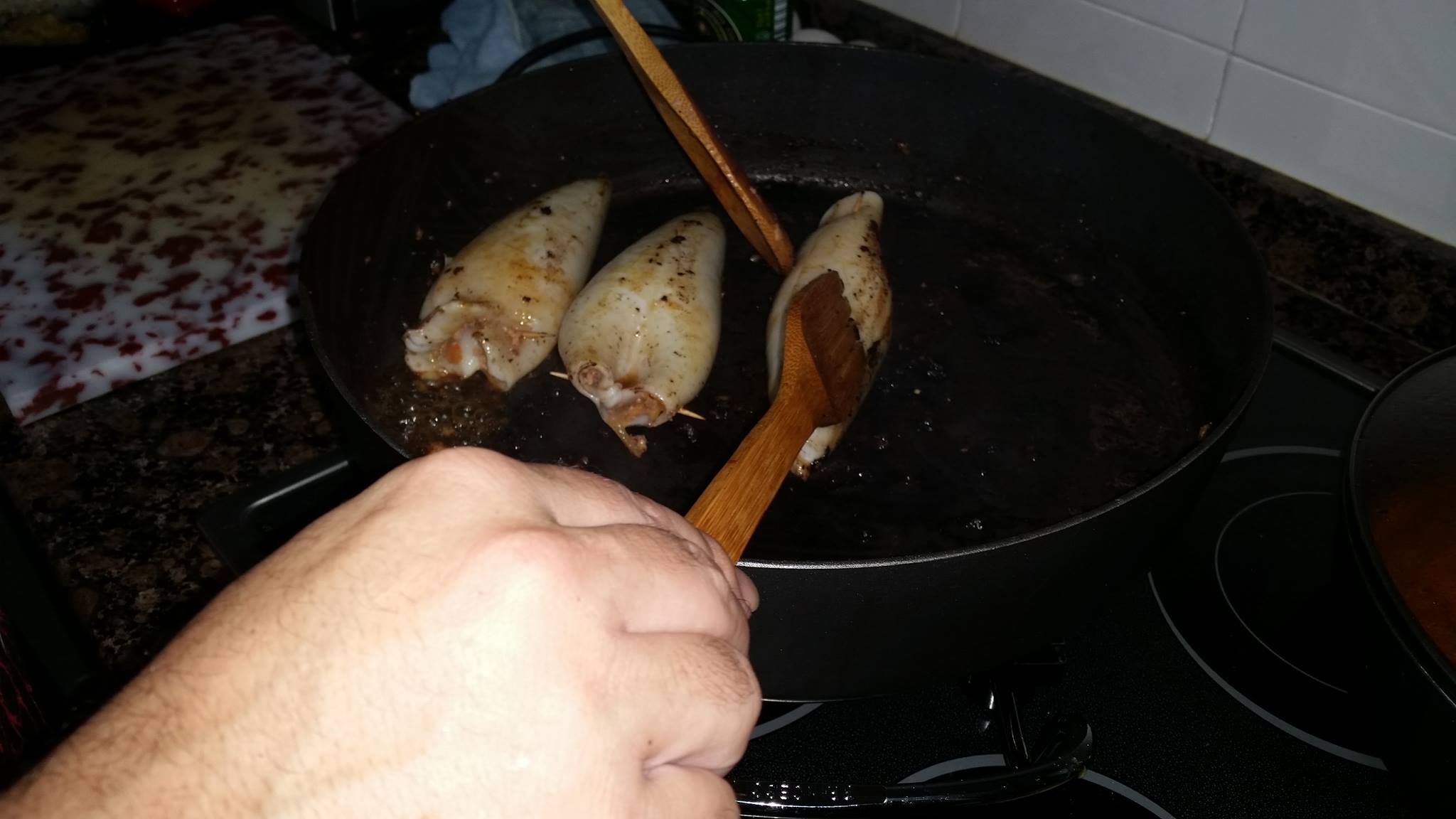 Una vez con todo preparadado ya podemos empezar con el sofrito del relleno, para lo cual añadiremos aceite de oliva en una cacerola o sarten grande donde vayamos luego a hacerlos. Cuando el aceite este caliente empezamos con el ajo, seguidamente la cebolla y por ultimo el pimiento, lo vamos moviendo de vez en cuando para que no se pegue ni queme. Cuando ya veamos que esta hecho le agregamos el picado del relleno que reservamos anteriormente. Lo movemos y mezclamos con el sofrito, seguidamente lo salpimentamos y añadimos el vino blanco, y lo dejamos reducir para que se evapore el alcohol, y ya tenemos el relleno listo. El siguiente paso consistira en rellenar los calamares con una cucharadita pequeña y una vez llenos casi hasta arriba lo cerramos y pillamos con un palillo de dientes de madera, para que despues no se salga el relleno.