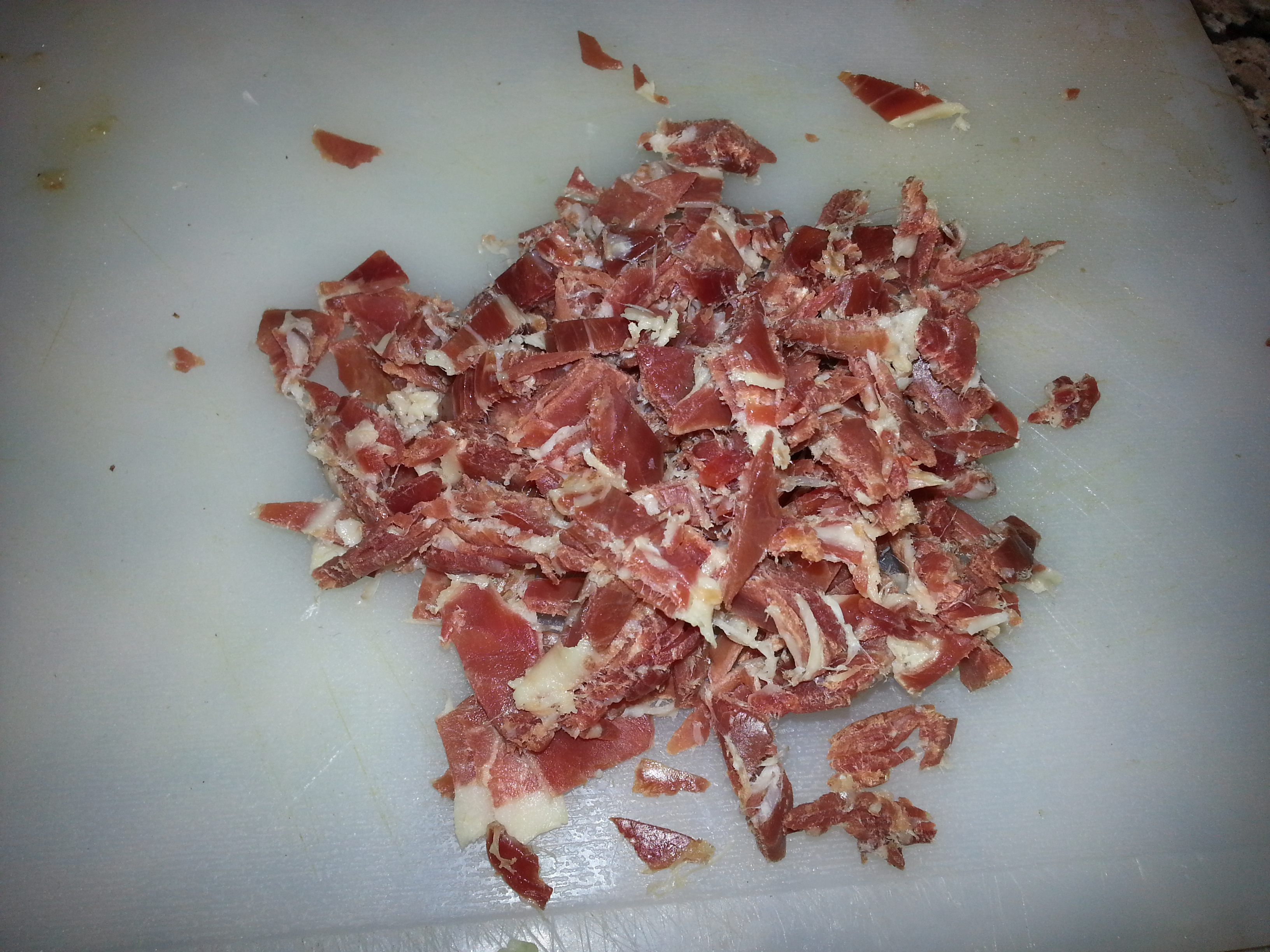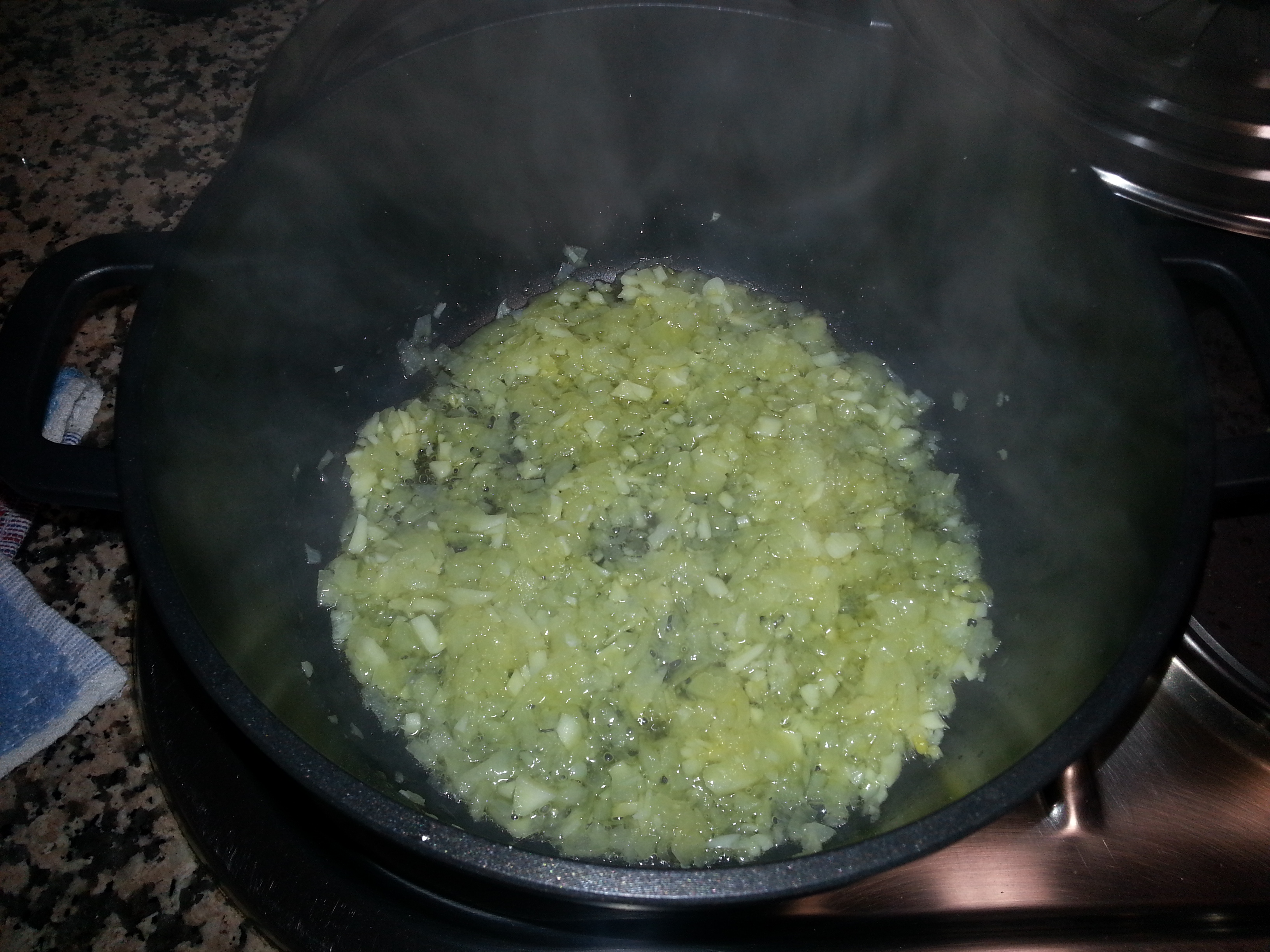 Mientras se enfria el pulpo vamos preparando el sofrito para lo cual picaremos muy chiquito y reservaremos los ajos, la cebolla, los tomates y el pimiento.
